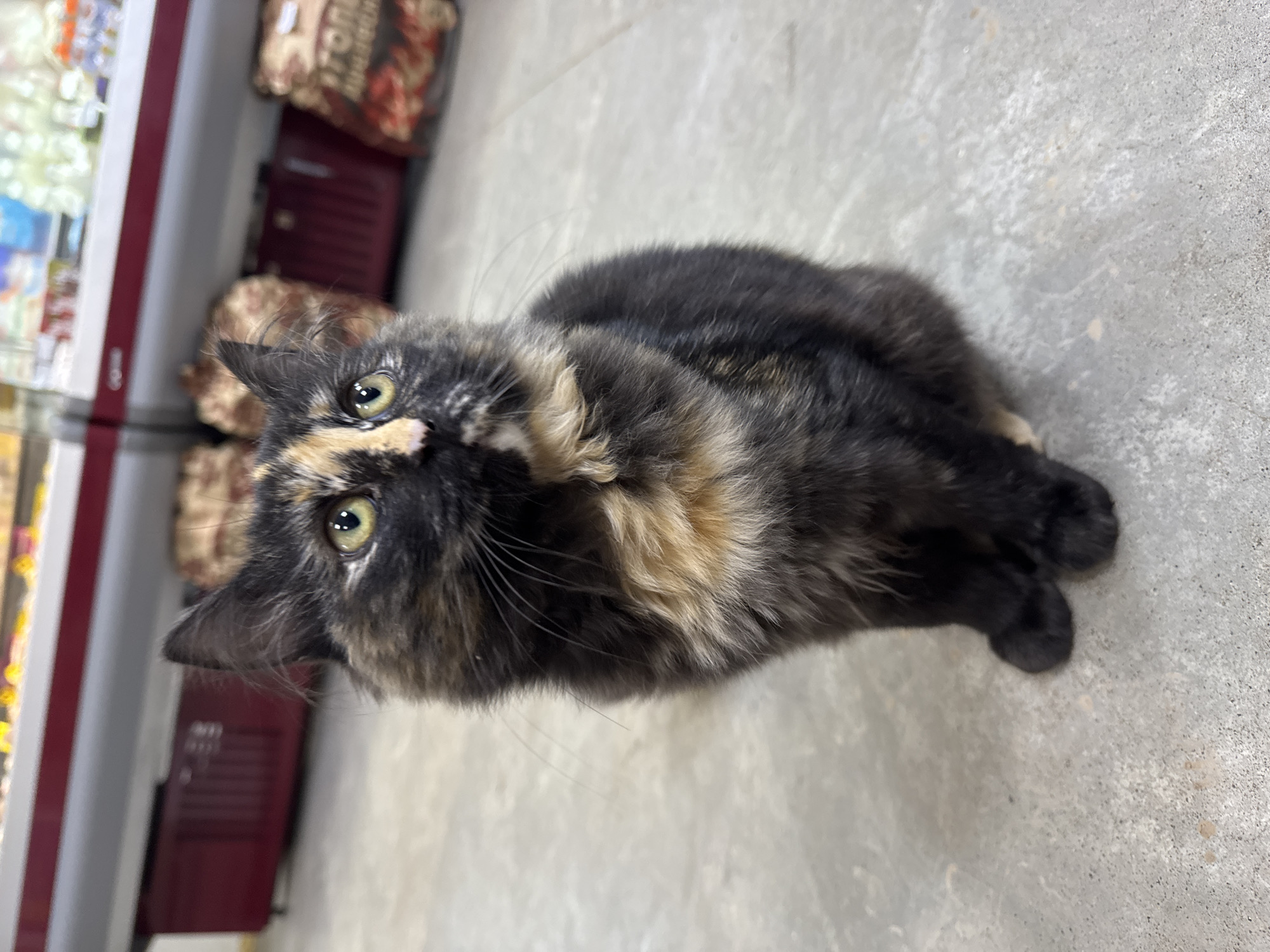 - "A tortoiseshell cat with black, orange, and cream fur is sitting on a light gray concrete floor, looking upwards and to its left" by FM-Xn6cT2, licensed under CC BY 4.0