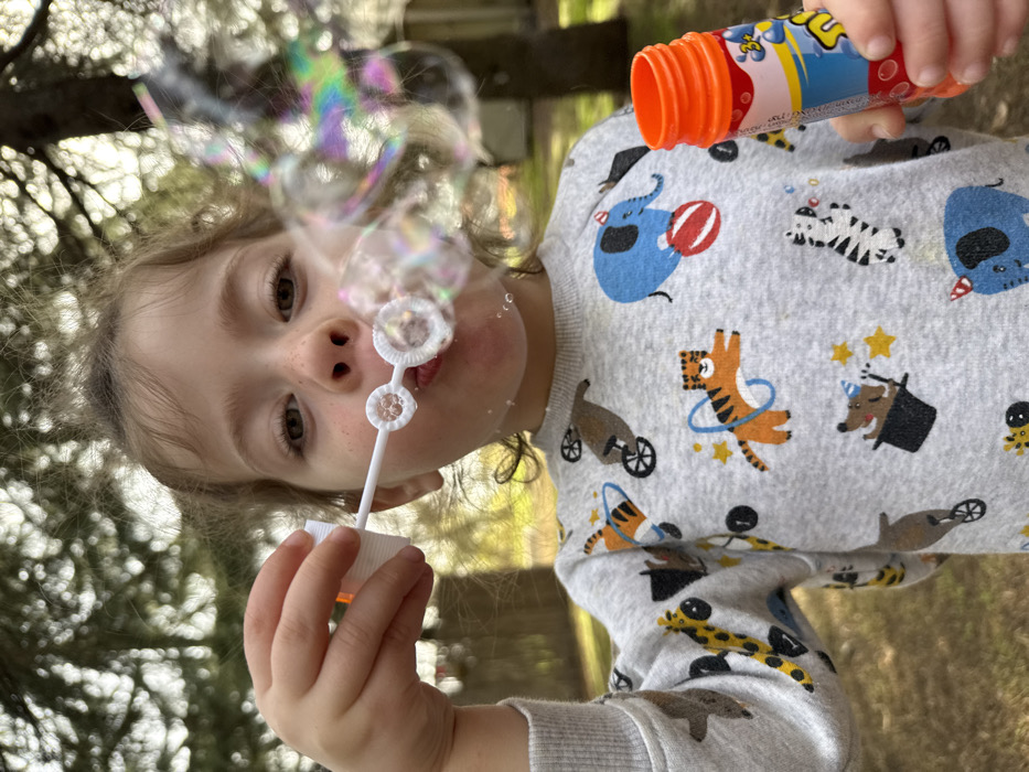A young child, appearing to be female, with light brown, curly hair and scattered freckles, is depicted outdoors in a medium shot, facing directly towards the camera. The child is actively blowing bubbles from a white plastic bubble wand held in their raised left hand. Their mouth is pursed, directing air through the wand, which has produced multiple iridescent bubbles floating in the air immediately in front of their face. In their right hand, held lower, the child grips an orange-capped bottle containing bubble solution, with a partially visible blue and red label. The child wears a light grey long-sleeved sweatshirt decorated with various cartoon animal illustrations, including an orange tiger, blue elephants, a black and white zebra, and a brown bear in a top hat. The background is blurred, showing green foliage, parts of tree trunks, and hints of an overcast sky, suggesting an outdoor environment. This scene is located in the Golan Regional Council, Israel.
