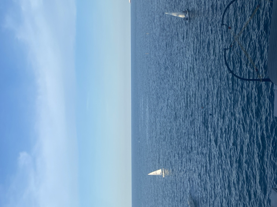 The image displays an expansive view of the Gulf of Mexico off Veracruz City, Mexico, under a clear blue sky with sparse, wispy white clouds. The horizon line is flat and extends across the mid-section of the frame. The foreground is occupied by the top edge of a dark structure, likely a pier or vessel, featuring a dark metal railing with curved elements and visible ropes or lines. The water is a deep blue, exhibiting moderate choppiness with distinct wave patterns. Two white-sailed dinghy-style sailboats are visible; one is positioned in the mid-ground to the left, and another is located towards the right, appearing to contain two occupants. Several small, dark objects, possibly buoys, are distributed across the water's surface. A faint outline of a large white vessel is discernible on the distant right horizon. A dark, partially submerged object, consistent with a swimmer or debris, is present in the lower-middle section of the water.