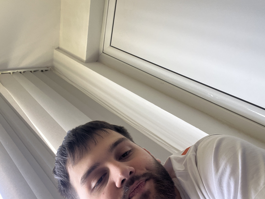The image displays a close-up, low-angle shot of a male subject indoors. The subject, positioned on the left side of the frame, has dark hair, a beard, and is looking downwards. He is wearing a white t-shirt with an orange detail visible on the right shoulder area. The background features a white vertical blind covering a window, located directly behind the subject's head and extending to the top right of the frame. To the right of the blinds and the subject, a white door or large white panel with a dark outline along its edge is visible. The walls and ceiling appear white or off-white. There are no other identifiable people, subjects, or objects, nor any discernible actions or interactions beyond the subject's pose. The environment appears to be a brightly lit interior room. The precise location within the city of Plovdiv, Bulgaria, cannot be determined from the visual information provided in the image.