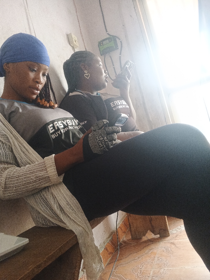 In an indoor setting in Fagge A, Nigeria, two females are seated. The individual in the foreground wears a blue head covering, a grey and black shirt bearing the text "EASYBUY BUY NOW PAY LATER," and a light-colored woven long-sleeved top. Her braided hair features reddish-brown tips. Her left hand, gloved in black with white dots and "DESIGN GLOVES" text, is positioned near a smartphone. The second individual, positioned behind and to the right, wears a black shirt with the same "EASYBUY BUY NOW PAY LATER" text and heart-shaped earrings. She holds a smartphone in her right hand, oriented towards a bright light source originating from the right side of the frame. Her visible left hand is also gloved in a black glove identical to the first. The background wall is light-colored, featuring a white circular wall plate and a green electrical meter with visible wiring. A portion of a wooden bench is visible in the lower left, and the floor is tiled with a reddish-brown, intricate pattern.