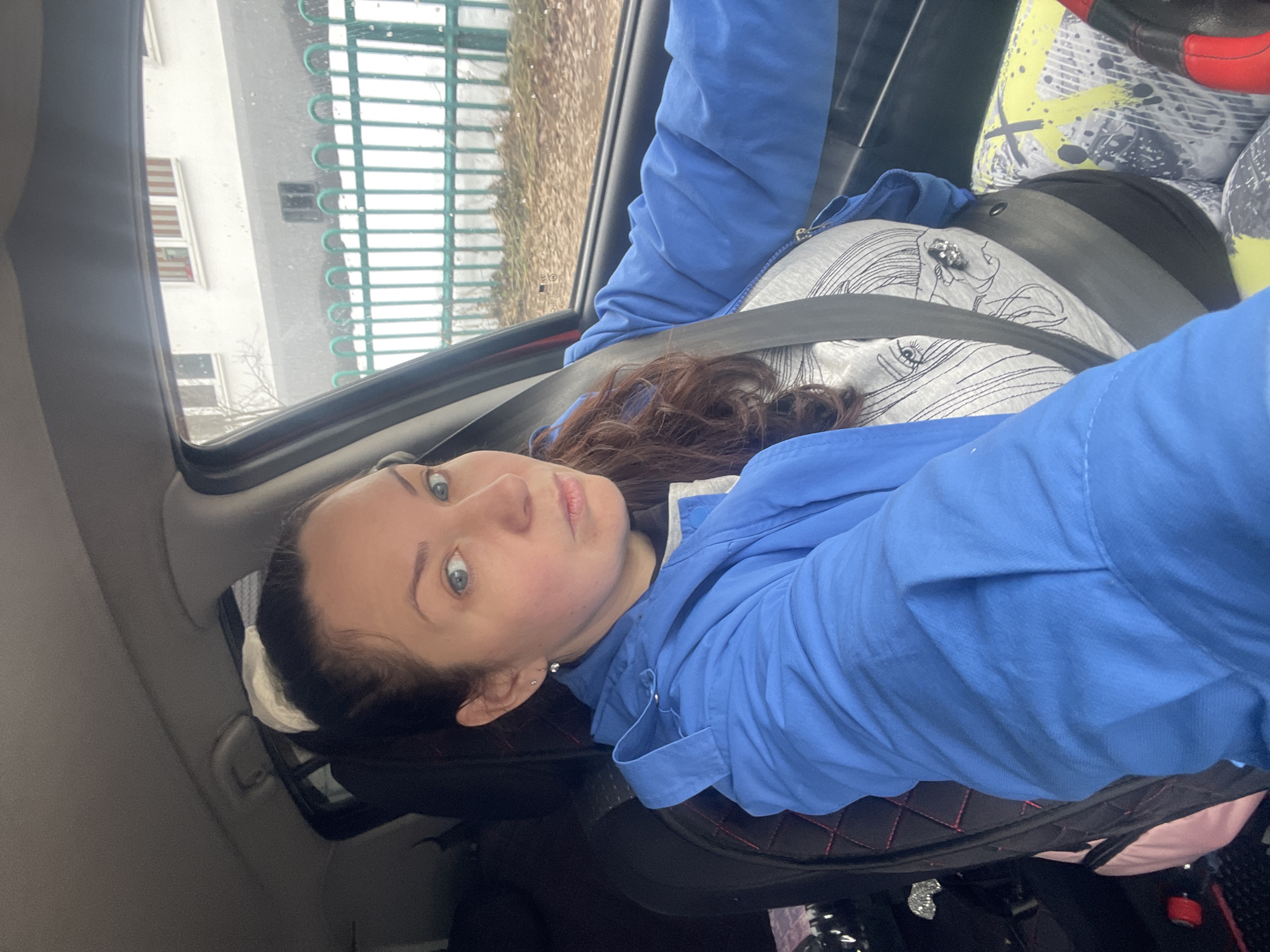 A woman is in the back seat of a car wearing a blue jacket and a seatbelt. Outside the car window is a building and a green fence. This could be a residential area in Chaikovsky, Russia.