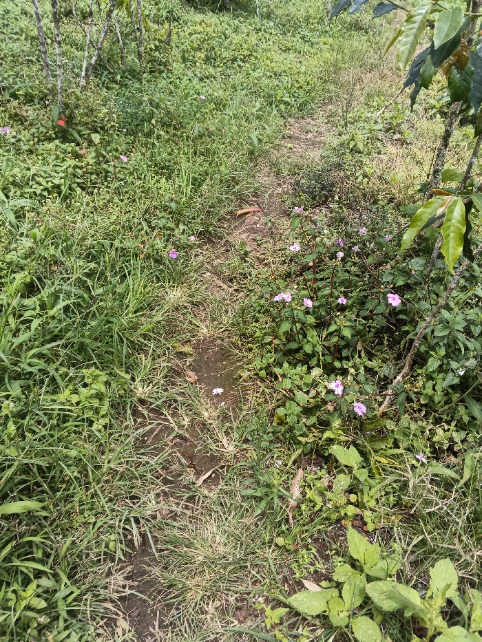 A narrow, overgrown path winds through a lush green landscape. Grass and diverse vegetation cover the ground. Scattered pink flowers add splashes of color amongst the verdant foliage. A few thin trees stand along the path's edge, while larger-leafed plants cluster near the foreground. The scene suggests a wild, untamed nature setting.