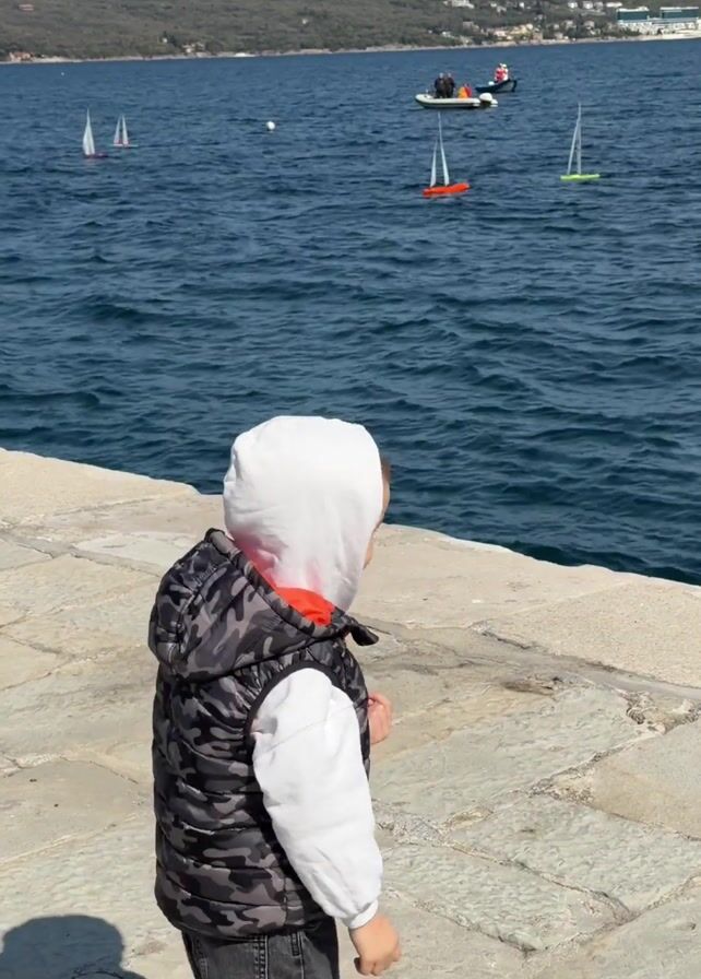 A small boy wearing a camouflage vest, white hoodie, and dark jeans stands on a stone pier, looking out at the water. Several small sailboats with colorful sails are on the water, along with a small motorized boat carrying several people. The water is dark blue and slightly choppy, with a green, forested area visible across the bay, followed by a distant city skyline and snow-capped mountains. The sky is blue with scattered clouds.