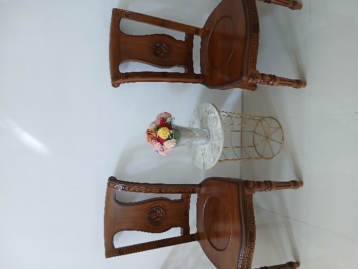 Two ornate, brown wooden chairs flank a small, round table with a marble top and gold wire base. A vase filled with colorful flowers sits on the table. The chairs are similar in design, with decorative backs featuring intricate detailing. The scene is set against a plain, light-colored wall, and the overall composition suggests a cozy or decorative interior setting.