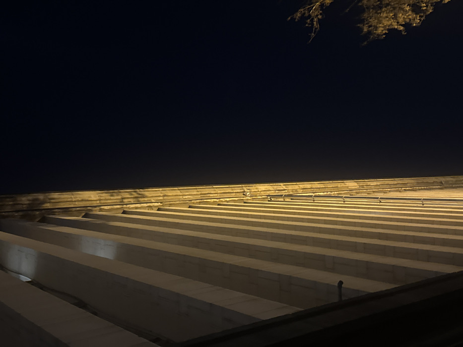 The image displays an upward, angled view of the upper facade of the National Palace of Culture (NDK) in Sofia, Bulgaria, during nighttime. The building exhibits numerous prominent, vertical architectural elements, likely concrete or stone ribs, which are illuminated by a warm, yellowish artificial light source originating from the right, casting distinct shadows and highlighting the texture. A small, dark pipe-like object protrudes from the lower-left section of the visible structure. The background is an unblemished dark night sky. A portion of a tree with sparse branches, illuminated by a warm light consistent with the building's illumination, is visible in the lower-right quadrant of the frame. No individuals, actions, or interactions are visible.