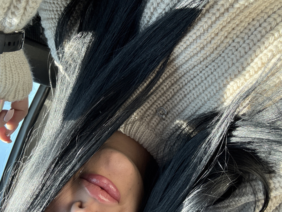 A close-up photograph captures a partial view of an individual, focusing on their lower face, hair, and upper torso. The subject's lips are prominent, appearing full and enhanced with a glossy, light pink substance. Long, straight, dark hair cascades across the frame, partially obscuring the lower face and extending over a light cream-colored, ribbed knit sweater. A thin, silver-toned chain necklace with a small, circular, open-ring pendant is visible resting on the sweater. In the upper right corner, a hand with manicured, light-colored nails is partially visible, adjacent to a wrist wearing a dark-colored digital watch with a wide strap. Strong, directional sunlight illuminates the scene, creating bright highlights on the hair and sweater and suggesting an outdoor or sunlit interior setting. A clear blue sky is visible in the upper left background, while a dark, indistinct element consistent with a vehicle's interior is visible in the upper right background. The scene is located in Septemvri, Bulgaria.