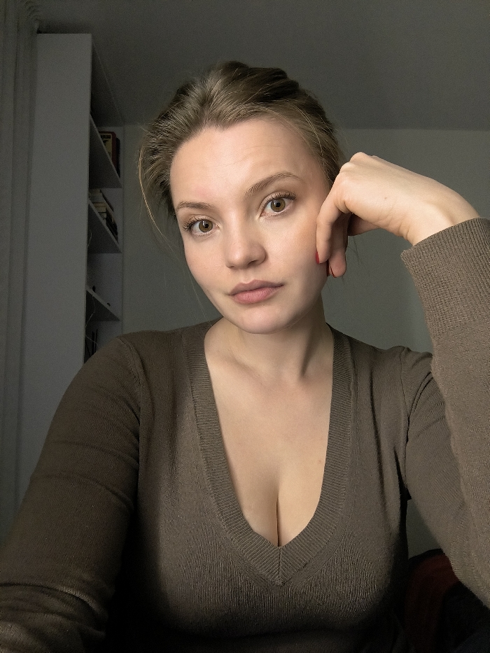 - "A fair-skinned woman with brown eyes and hair pulled back poses indoors" by FM-dWhzM2, licensed under CC BY 4.0