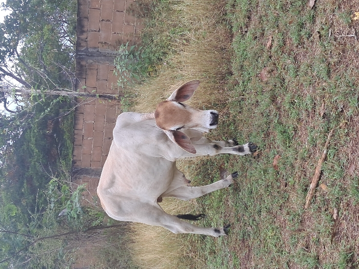 - "The scene, located in Ciudad Bolivar, Venezuela, displays a lean, light-cream-colored bovine, possibly a Zebu calf, with a brown head and ears, standing on patchy ground" by FM-eKnf52, licensed under CC BY 4.0