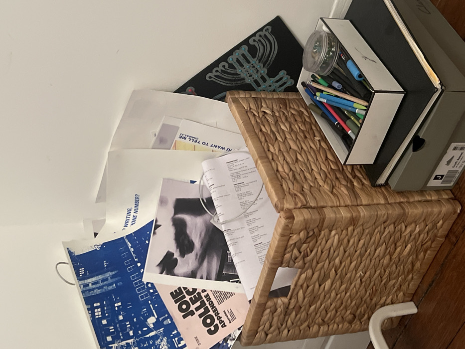 The image displays an interior corner of a room, likely located in Paris, France, indicated by visible French text on documents. No individuals are present. The scene is characterized by a cluttered storage arrangement on a reddish-brown wooden floor against white walls. A large, rectangular light-brown wicker basket occupies the central-left portion, filled with assorted papers and documents. Within the basket, a blue and white bag or document featuring an abstract cityscape design is prominent. A light pink document or booklet partially reads "JOIE COLLECT" and "APPRENDRE P...". Also visible are a black and white abstract image, and several white papers, one with the partial text "WRITING, 'ONE NUMBER?'" and another displaying "YOU WANT TO TELL ME CARGA-23". A white cable is draped over these papers. To the right of the basket, a dark canvas with a light blue and grey abstract, geometric design leans against the wall. In front of the canvas, a white rectangular container with a black border, filled with numerous pens, pencils, and markers of various colors, rests atop a stack. Adjacent to this pen holder is a small, clear plastic cylindrical container with a green lid, possibly holding craft items. The pen container is stacked on a black book or notebook, which in turn sits on a light grey shoebox. The shoebox carries a "J" label and the "Clarks" brand logo, with "Craft Speed" visible on its side. A curved white object, possibly a furniture leg, is partially visible in the bottom-left corner.