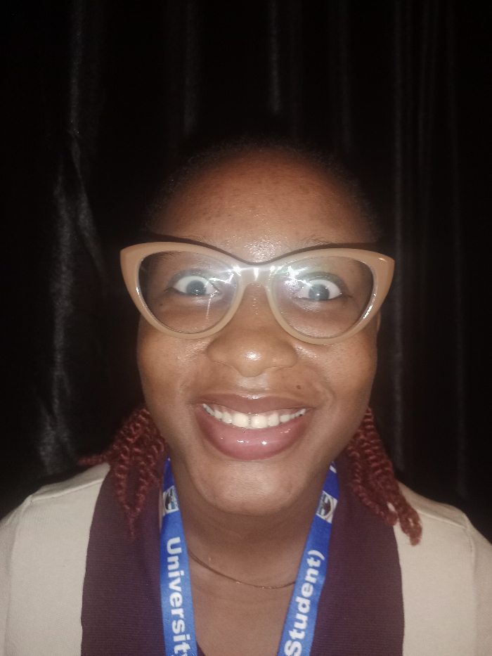 The image displays a head-and-shoulders portrait of an adult individual with dark skin, centered against a uniformly dark background, possibly a dark curtain with vertical folds. The specific location within Rafin Par, Nigeria, cannot be determined from the visual information provided. The individual, appearing female, is looking directly at the camera with wide-open eyes, which are blue-gray in color. She is wearing light-colored, possibly beige or cream-colored, cat-eye style eyeglasses, with bright reflections visible on the lenses. Her mouth is open in a wide smile, revealing both upper and lower teeth, with a prominent gleam on her lips and the tip of her tongue slightly visible. Her hair, which appears dark and pulled back, shows reddish-brown braided or twisted strands extending downwards on both sides of her face near her shoulders. Around her neck, a thin, golden-colored necklace is visible. She wears a blue lanyard with white text, partially legible as "University" and "Student)", indicating an attached identification card or badge. Her attire consists of a dark maroon or reddish-brown top, layered under a light-colored, possibly beige or cream-colored, outer garment, such as a cardigan or jacket. The subject's expression suggests an exaggerated or humorous surprise.