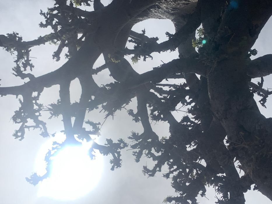 The image displays a massive, deciduous tree, characterized by a thick trunk and a complex network of gnarled, extensively pruned branches, located in Dabawa, Nigeria. The tree is silhouetted against a bright, overcast sky, with the sun's disc visible in the upper left, emitting a prominent lens flare and backlighting the scene. Numerous stubby branchlets exhibit nascent clusters of small, light green foliage, indicating new growth. The environment consists solely of the tree and sky. No human figures, animals, man-made objects, actions, or interactions are present within the frame.
