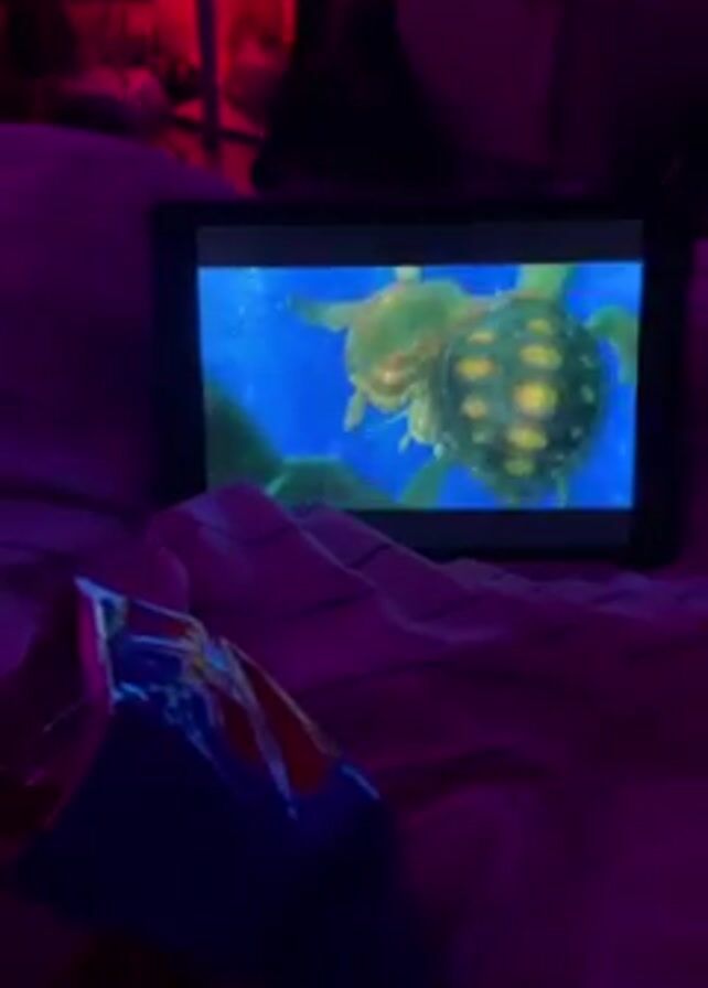person in bed watching a movie on a tablet and eating chips. The tablet is positioned in the center of the shot, displaying a scene from the movie "Finding Nemo," featuring sea turtles. The bed is covered with striped bedding. In the lower left corner of the frame, there is a partially open bag of chips. The room is dimly lit with a combination of blue and red light, creating a cozy, relaxed atmosphere. The person is not fully visible, but some of their silhouette is present in the background.