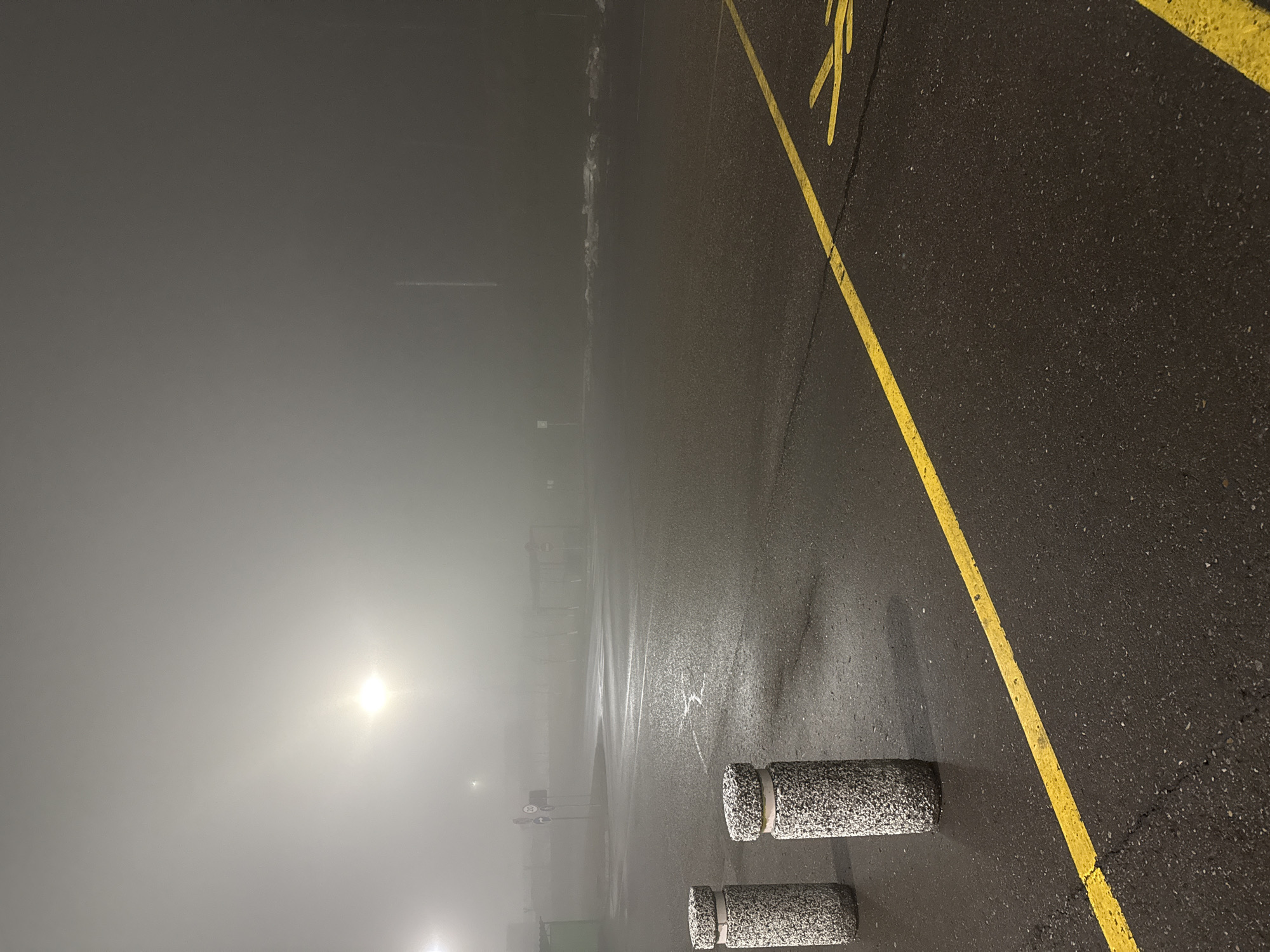 The image depicts an outdoor parking lot in conditions of heavy fog. The visible ground is asphalt, marked with a yellow line indicating parking boundaries. Several concrete bollards are present near the bottom of the image. In the background, diffused light sources suggest street lamps obscured by the fog. The location is potentially in Ромашка Нп, Russia, though no specific identifiers confirm the exact location beyond the description.