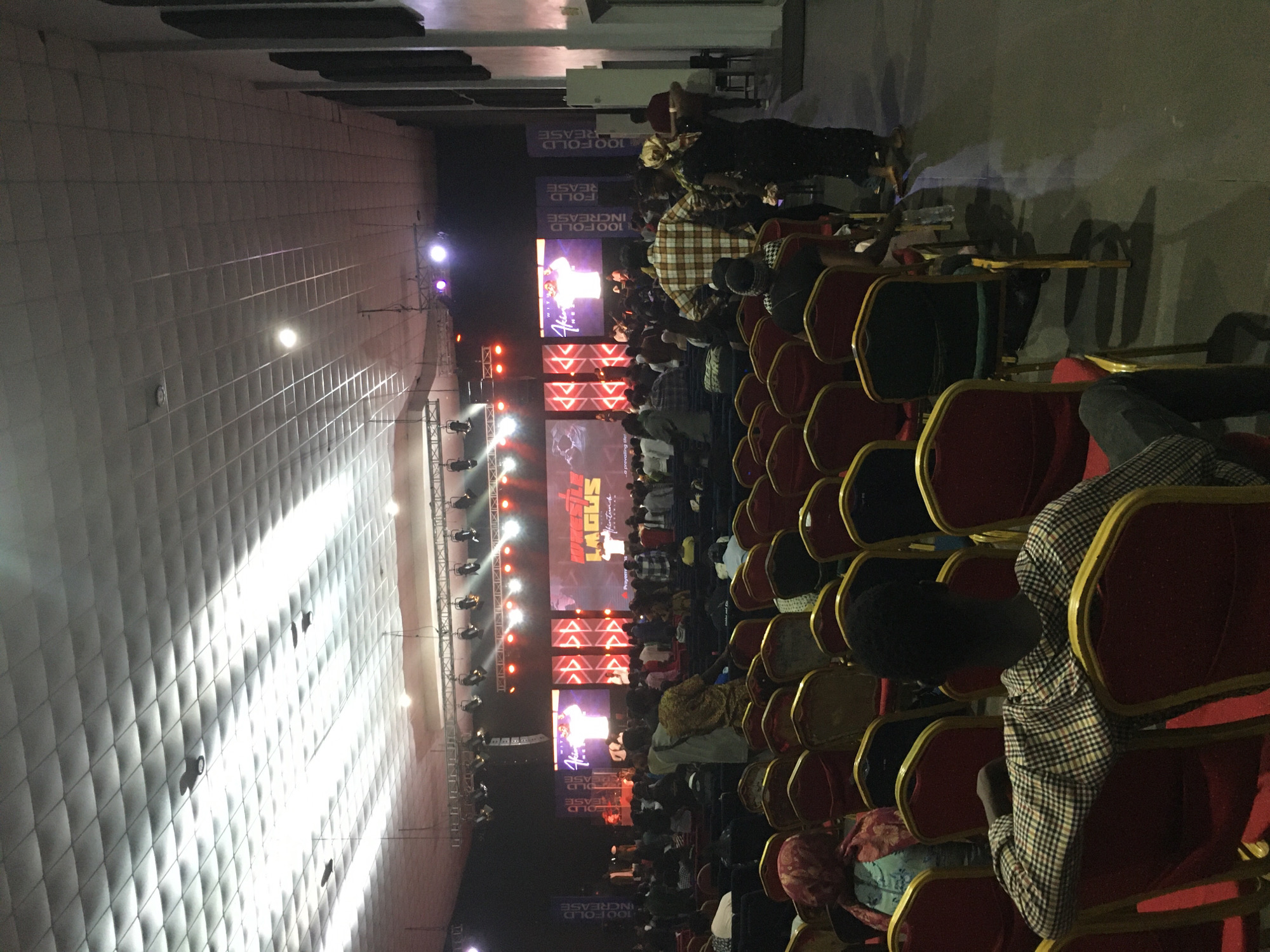 The image depicts the interior of a large assembly hall in Lagos, Nigeria, during an event identified by on-screen text as "WRESTLE LAGOS" and "Prayer Marathon Lagos." The hall features a high ceiling with a grid of white square acoustic panels, interspersed with circular light fixtures. A stage occupies the far end, equipped with metal trusses supporting multiple spotlights emitting white, red, and purple light. Three prominent LED screens on the stage display event branding, including text like "WRESTLE LAGOS" and "100 FOLD INCREASE," along with images of a speaker. Tall blue banners reading "100 FOLD INCREASE" flank the stage. The floor is a dark, smooth surface. Rows of red and gold-framed chairs, predominantly upholstered in red, fill the foreground and midground. Many chairs are occupied by attendees, while others remain empty. A diverse group of individuals, primarily adults, are present; some are seated, while numerous others stand in the aisles and closer to the stage. Attendees wear varied attire, including plaid shirts, patterned dresses, and head coverings. A plastic water bottle rests on the floor next to an empty chair in the lower right. Dark vertical panels are visible on the right wall.