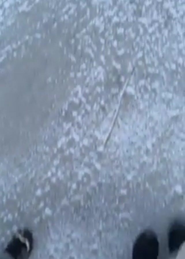 first-person perspective of two people walking on a surface covered in ice and snow. The camera is pointed downwards, primarily showing the feet and legs of the individuals as they move. One person is wearing light-colored pants and dark shoes, while the other is wearing darker clothing and footwear. The surface is predominantly white with patches of ice and snow, and a few small twigs are visible on the ground. The movement suggests the people are walking, possibly on a frozen body of water or a snow-covered area.