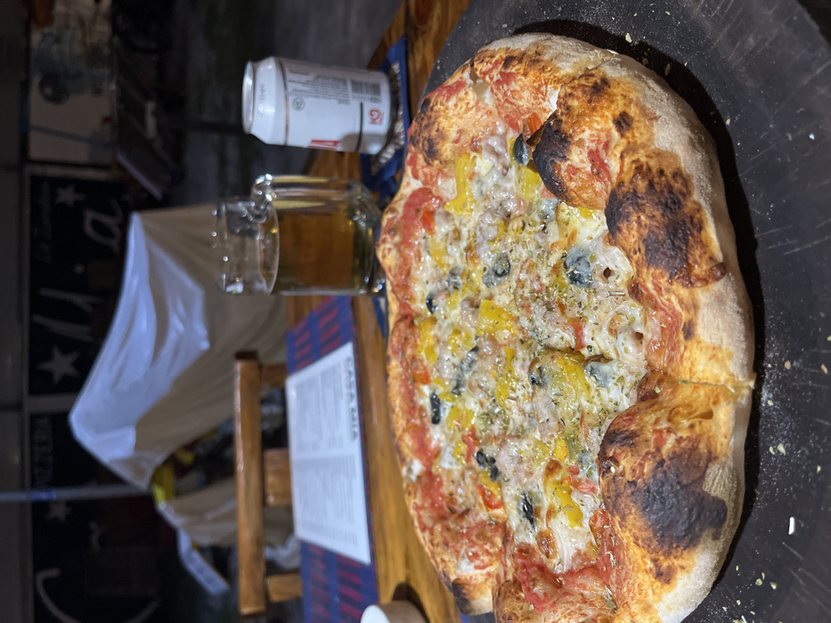 The image captures a dining table scene at Casa Mia Pizzeria in Preah Sihanouk, Cambodia, at night