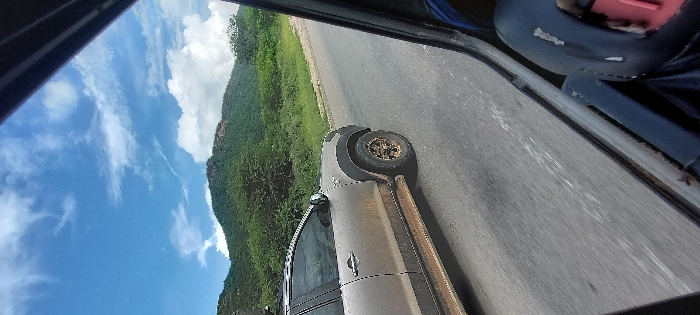 A forensic examination of the image reveals a dynamic scene captured from within a moving vehicle in Ruaha Darajani, Tanzania. The primary subject is a silver/grey pickup truck, heavily coated in dirt and mud, traveling on a paved asphalt road. This truck exhibits black fender flares, bronze-colored multi-spoke wheels fitted with off-road tires, and visible side steps also covered in debris. A partial roof rack is discernible above the front door. The background consists of verdant, densely vegetated hills and mountains with scattered rocky outcrops, extending towards a bright blue sky marked by sparse white clouds. The foreground includes elements of the observer's vehicle: a dark window frame and pillar are visible on the right side of the frame, and a dark blue object with a red accent, consistent with a vehicle's interior component, is partially visible in the lower right corner. Both vehicles appear to be in motion, traveling in the same general direction. No individuals are identifiable within the frame.