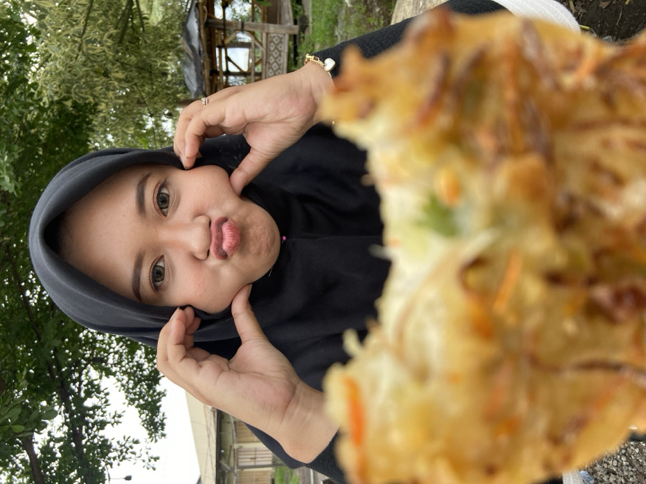 A woman in a black hijab playfully poses by squeezing her cheeks and puckering her lips. She’s wearing a ring and a gold bracelet with white charms. A blurry, golden-brown fritter dominates the right foreground. Behind the woman, a tree and a gazebo-like structure are visible. The background is slightly out of focus, suggesting a natural or outdoor setting.