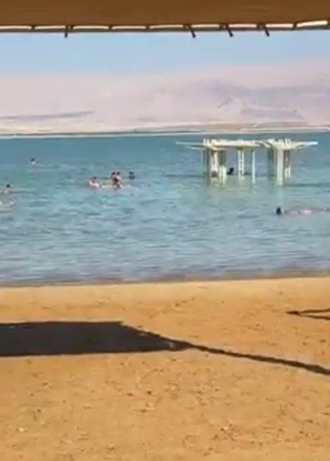 view of the Dead Sea on a sunny day. The camera pans from right to left across a sandy beach with several people relaxing under white-roofed sunshades. In the water, several people are floating. The water is a calm, turquoise color, and there are mountains visible in the distance across the sea. A man in red swim trunks is seen looking at his phone. A woman and a young boy walk along the beach.
