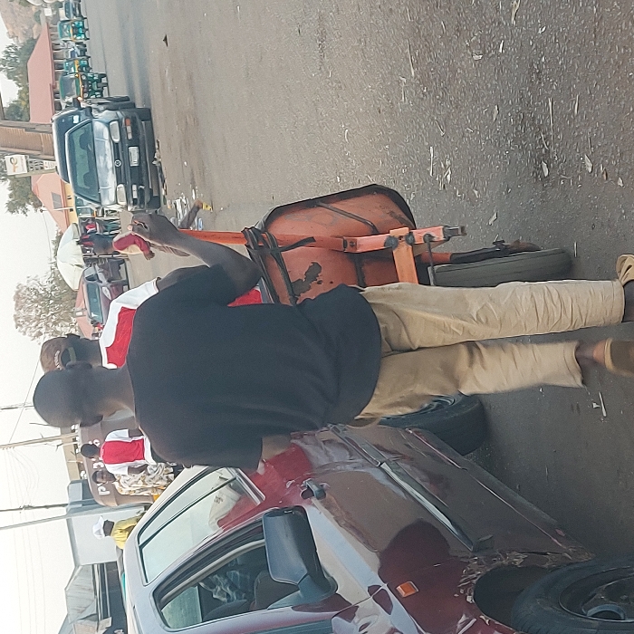 A street scene is captured with a red car in the foreground. A man in a black shirt and khaki pants stands by the car, seemingly engaging with a wheelbarrow. A tire rests near the vehicle. Further back, more people are visible, and various cars line the street. Buildings flank the roadside, completing the urban setting.
