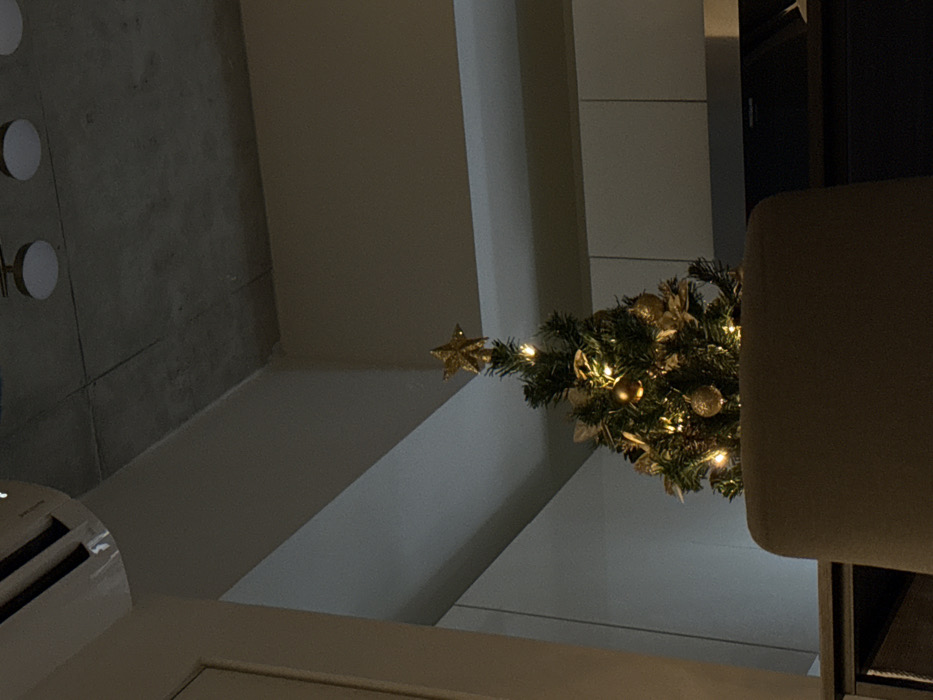 A small, decorated Christmas tree with golden ornaments and lights sits on a white surface, possibly a table or countertop. The tree has a golden star on top. A portion of a beige chair is in the right foreground. The background consists of white, rectangular panels and a grey wall with circular fixtures. The lighting is soft and somewhat dim, creating a cozy atmosphere.
