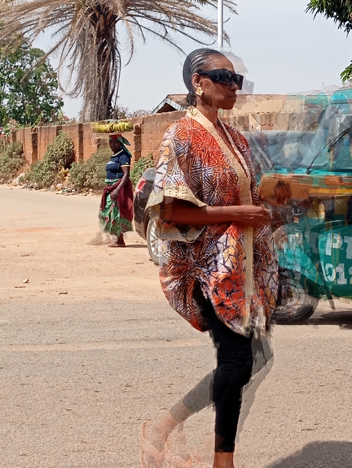 This image captures a bright daylight street scene in Unknown, Unknown. The primary subject, a female, moves from right to left in the foreground, characterized by significant motion blur across her body and lower extremities. She wears dark sunglasses, gold flower-shaped earrings, a multi-colored patterned kimono-style top (red, orange, white, blue geometric design), and black leggings, with a light-colored sandal visible on her right foot. In the midground, to the left, a second female stands, carrying a tray of yellow bananas on her head. She is dressed in a blue top, a green, red, and yellow patterned skirt, and a headwrap. Behind the foreground subject, a light blue three-wheeled auto-rickshaw, bearing 'PT' and '012' markings, is partially visible and also shows signs of motion blur. A dark sedan is positioned between the two individuals. The environment includes a light-colored paved road, a reddish-brown brick wall with green foliage on the left, a prominent palm tree with dry fronds in the background, and a clear, light blue sky.