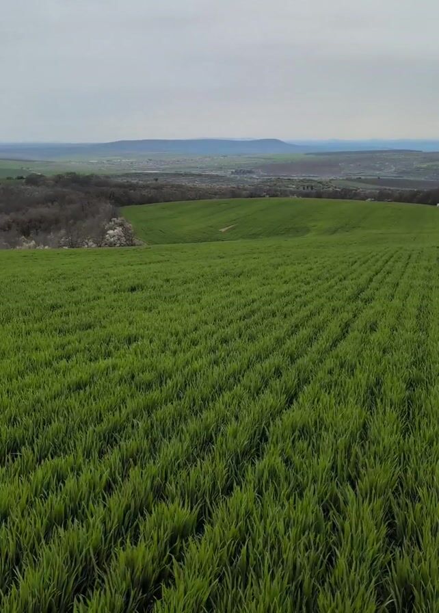 A verdant field stretches toward the horizon, framed by an overcast sky. The field, abundant with young, green crops arranged in neat rows, gently slopes downwards. In the distance, the landscape reveals a mix of trees, buildings, and rolling hills under the muted light. The perspective is from a slightly elevated position, potentially inside a vehicle or structure, as indicated by a dark, blurred object partially visible at the bottom of the frame.