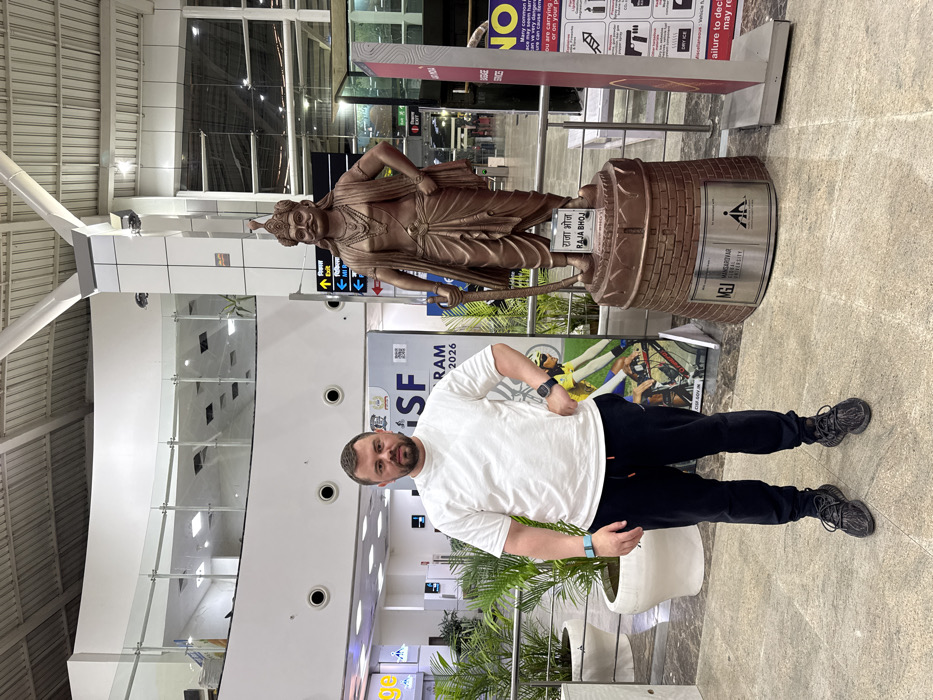 A man stands in front of a bronze statue of Raja Bhoj in what appears to be an airport or large public space