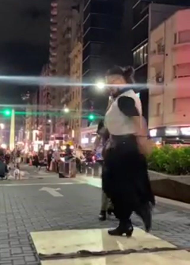 A man dances on a small, square, gray platform in a city street at night. He wears a white vest, a black t-shirt, black baggy pants, and black heeled boots. His hair is pulled back in a ponytail, and he has a beard and glasses. He is facing the camera and performs a rhythmic tap dance, stomping and moving his arms in time with music that can be heard. A tan drum-like instrument hangs from his neck. The background is blurred, showing city buildings lit up at night, pedestrians, and streetlights. A green traffic light can be seen.