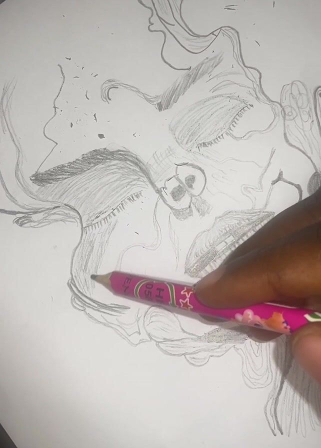 A close-up video shows a person's hand using a pink pencil to draw on a white piece of paper. The drawing appears to be an abstract sketch, with elements of a skull visible. The pencil has floral designs on it and the letters "EGH" are visible on the side. The person is adding shading and detail to the drawing with short, deliberate strokes. Pencil shavings are scattered around the drawing on the paper. The background is blurry and shows the corner of what might be a table. The lighting is bright and the focus is on the hand and the drawing.