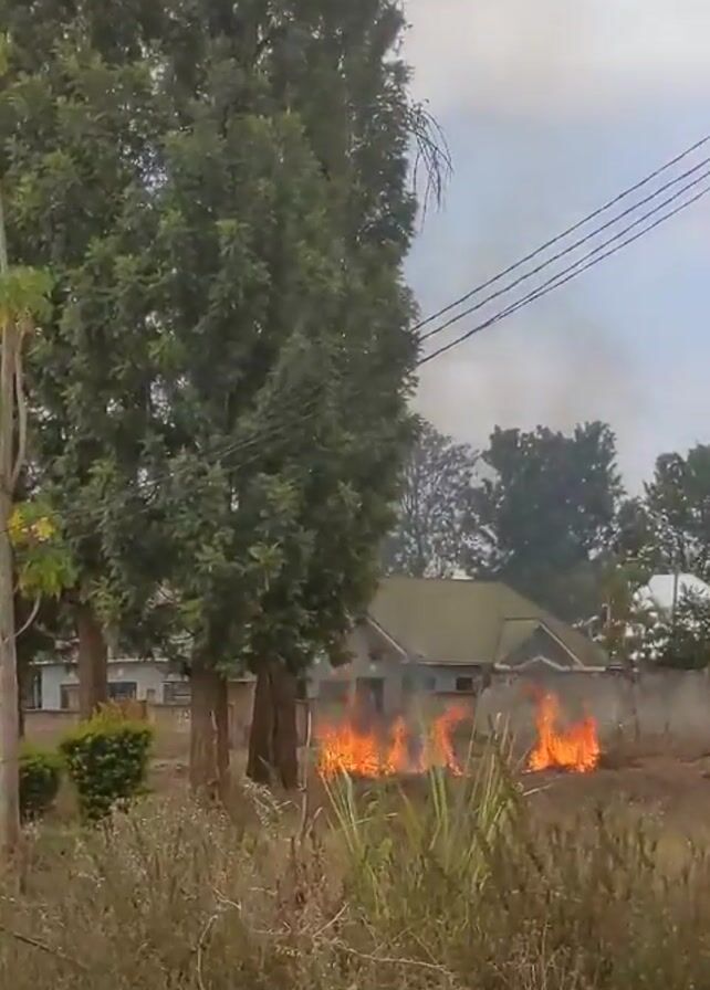 The scene is a yard with grass on fire