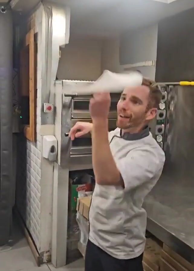 A chef is seen in a brightly lit kitchen. He is wearing a short-sleeved white chef's coat and dark pants, with a tattoo visible on his left arm. The chef is tossing and spinning a round, flat piece of white dough into the air, seemingly practicing pizza-making skills. He is smiling and looking towards the camera. Behind the chef are industrial kitchen appliances, including multiple ovens. The kitchen has tiled floors and walls with various equipment and supplies stored around.
