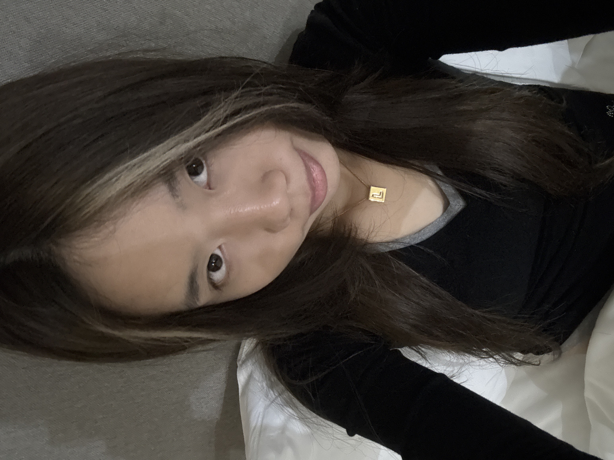 A young Asian woman is lying on her side, looking up at the camera. She has long, dark brown hair with a blonde streak near her face. She is wearing a black long-sleeved shirt with a gray neckline and a gold pendant necklace. She is lying on a gray upholstered surface, possibly a couch, with white bedding visible in the background. The location is Yuzhong District, China, but this image doesn't provide any information about the place.