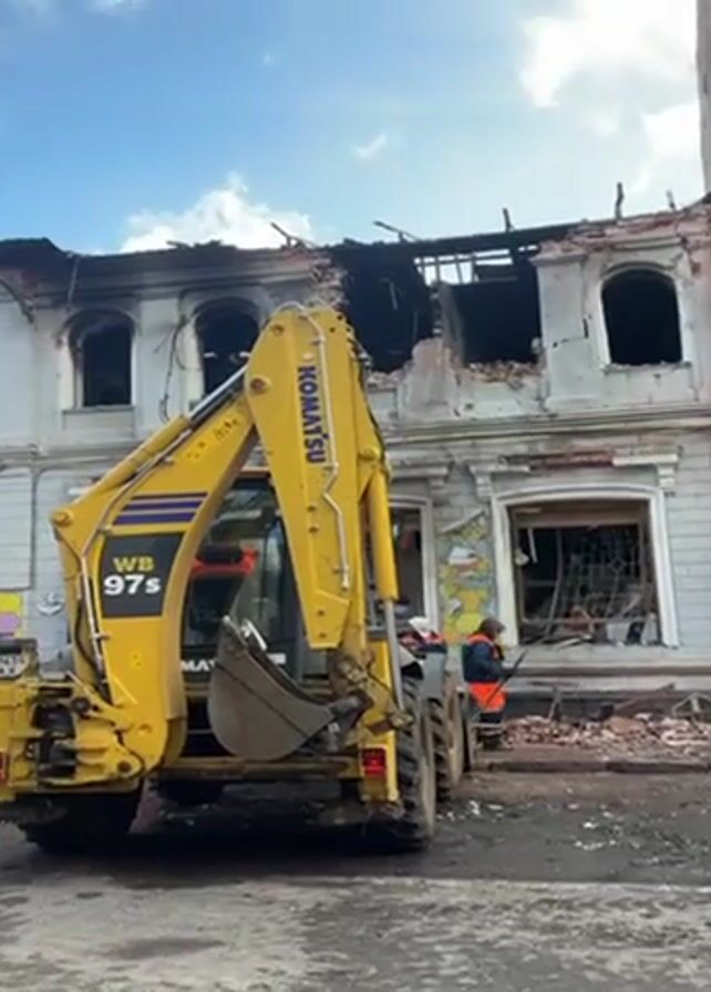 The scene shows the aftermath of a disaster, with a heavily damaged multi-story building in the background. The building's windows are broken, the roof is partially collapsed, and there is evidence of fire damage around the window openings. A yellow Komatsu backhoe loader is positioned in the foreground, facing the damaged building, and it appears to be involved in clearing debris or demolition work. Several people in safety gear, including orange vests, are working in the area around the building's base, using tools to clear debris. The sky is partly cloudy. The overall atmosphere suggests a rescue or recovery operation following a destructive event.