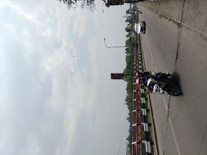 The image depicts an asphalt two-lane road on an elevated structure, reportedly located in the city of Nieste, Germany. The sky is overcast with light grey clouds, showing several indistinct dark specks, possibly birds. In the foreground, a dark-colored scooter, identifiable as a Honda Vario model, travels away from the viewer. It is occupied by two individuals. The driver, wearing a blue long-sleeved top and a pink full-face helmet, is in the front, with their left hand on the handlebar. The passenger, seated behind, wears a dark green jacket, dark pants, and a dark full-face helmet, carrying a bag over their left shoulder. The road surface exhibits cracks and patches. A double yellow line separates the two lanes, and a white solid line marks the right edge, bordering a concrete sidewalk. To the left of the road, a bridge railing features red horizontal bars supported by black and white striped vertical posts. Beyond this railing, dense green foliage, consistent with trees and bushes, fills the mid-ground, suggesting a valley or lower terrain. Distant hills are faintly visible on the horizon. On the right side of the road, a tall streetlamp extends over the carriageway. Two dark vertical billboards, one in the mid-ground and one further in the background, are visible; the closer one displays a red logo. Further down the road, a white multi-purpose vehicle (MPV) or SUV travels in the right lane, followed by another distant motorcycle. Sparse tree branches are visible along the far right edge of the frame.