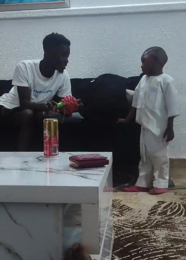 two people, one a young man and the other a young child, in what appears to be a living room. The young man is sitting on a black couch, wearing a white t-shirt with the words "HelloLabs" on it, and black shorts. He's holding a red and green toy in his hands and smiling. A can of Amstel beer and a small maroon wallet are on the white marble-patterned coffee table in front of him. The young child, wearing a white outfit, stands in front of the coffee table and looks at the young man, appearing to be engaged in a conversation. The background includes a patterned brown and beige rug, a picture hanging on the wall behind the couch, and a view of someone's feet at the bottom of the frame, indicating they may be filming the scene.
