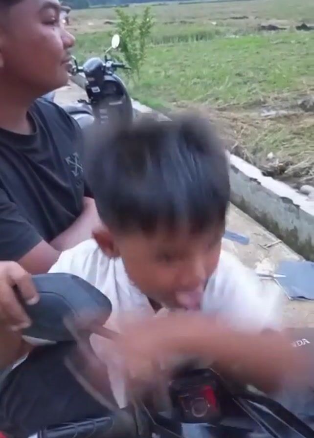 Two males are positioned on a black Honda scooter in an outdoor setting. One male, presumably older, sits behind, while a younger boy sits in front, sticking his tongue out initially and then placing his hands on the scooter's front section. In the background, there's a field, a white concrete border, and another scooter. A person wearing a #23 shirt walks in the background.