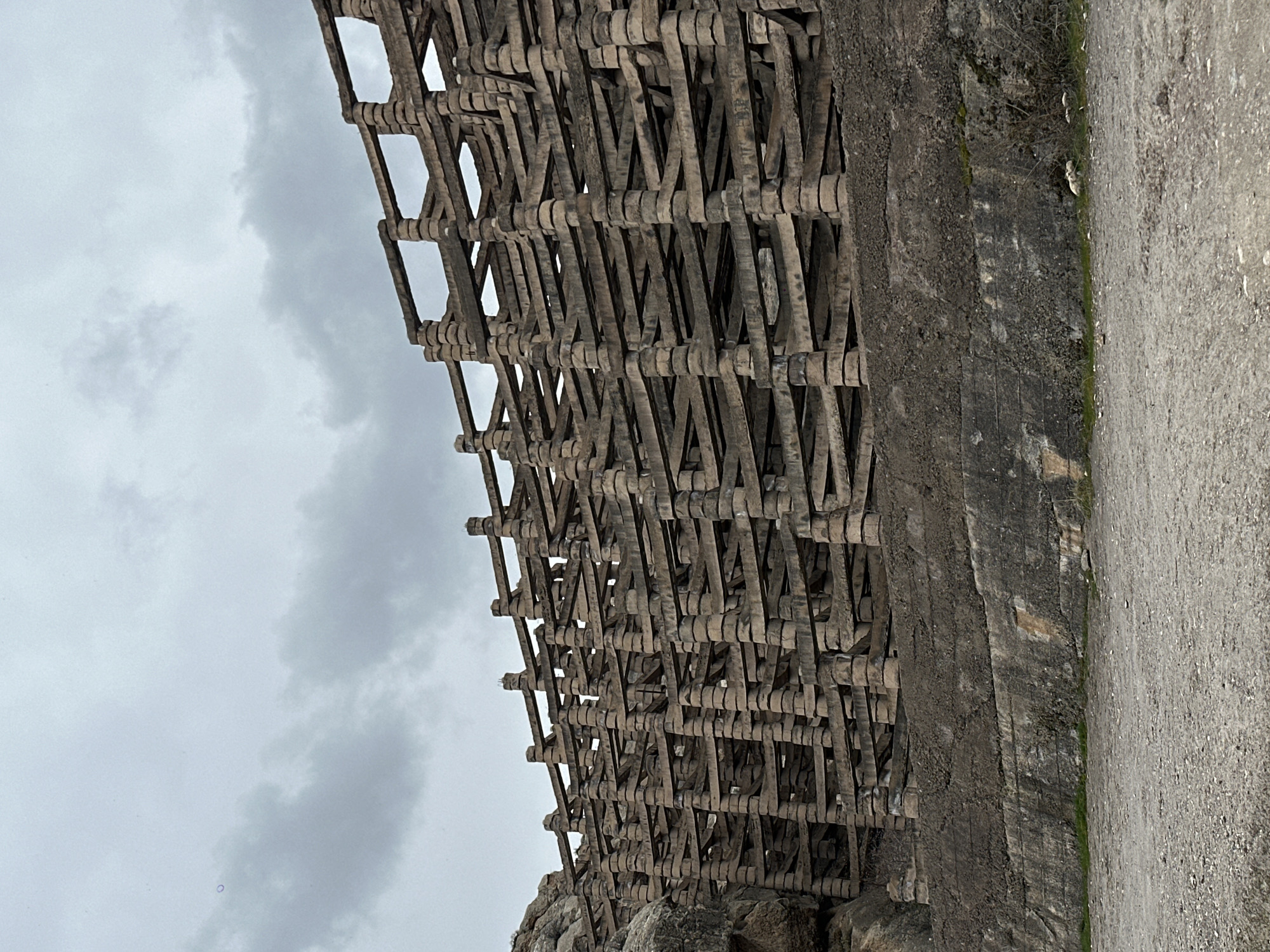 The scene depicts an outdoor environment in Areni, Armenia, under a uniformly overcast, light grey sky. The dominant feature is a large, multi-tiered structure in the mid-ground, constructed from dark, weathered concrete or stone. This structure forms a grid-like framework comprising numerous vertical segmented columns, resembling stacked disks, interconnected by horizontal rectangular beams. It extends across most of the frame horizontally and reaches high into the upper portion. On the left, the structure abuts a natural, light-colored rocky outcrop. Its lower section rests upon a roughly textured, dark grey concrete or rock wall that forms a tiered base, topped with dark grey-brown dirt and rubble. The immediate foreground consists of a flat expanse of light grey-brown gravel and dirt. Sparse patches of green vegetation are visible at the base of the lower wall. No individuals, animals, or discernible actions are present. A faint, small, purple-blue ring artifact is visible in the upper-left portion of the sky.