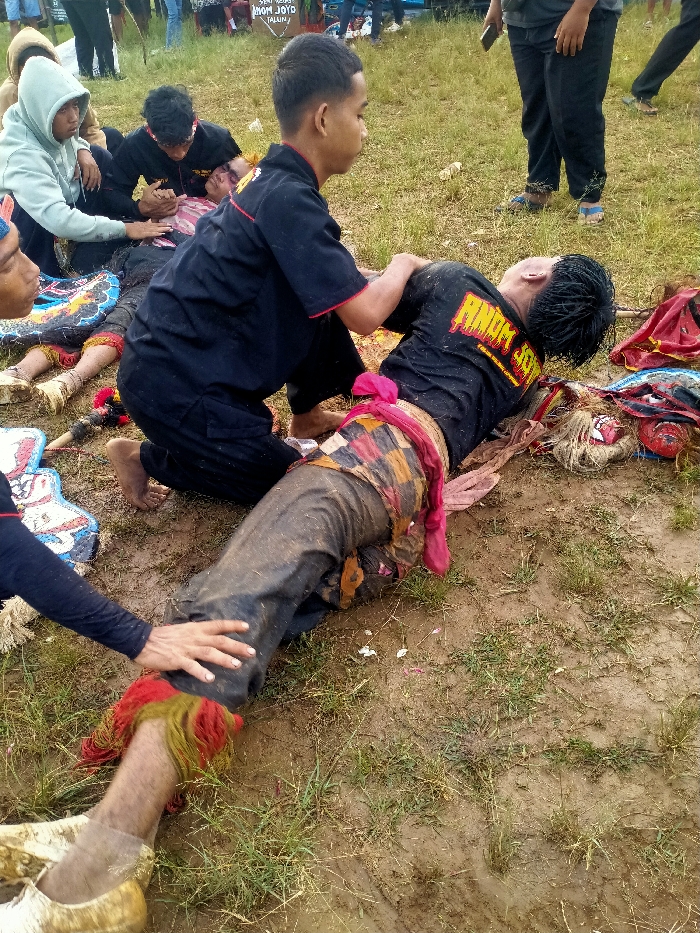 The image depicts an outdoor scene in Sidomukti, Indonesia, on a muddy, sparsely grassed field. In the foreground, a young male lies supine, head turned right, wearing a black t-shirt with "ANOM JOYO" in yellow and red text on the back, dirty dark pants, a colorful checkered fabric waist wrap secured by a pink sash, and red and green fringed ankle adornments over gold-colored footwear. Another young male, barefoot and dressed in a black short-sleeved shirt with red trim and black pants, kneels beside the supine individual, placing his hands on the supine individual's upper back and shoulder area. To the left, a third individual, wearing a dark long-sleeved shirt with red cuff trim, gently touches the first individual's lower left leg. Further left, partially visible, another individual is lying on the ground in similar attire, alongside a decorated flat board-like prop. In the mid-ground left, a person in a light green hooded sweatshirt sits on the ground, observing the scene. Several other blurred figures are standing in the background, one holding a smartphone. A white tent-like structure and a partially visible sign with Indonesian text are visible in the far background. The ground exhibits patches of grass and exposed dirt, with some scattered debris including a plastic bottle.