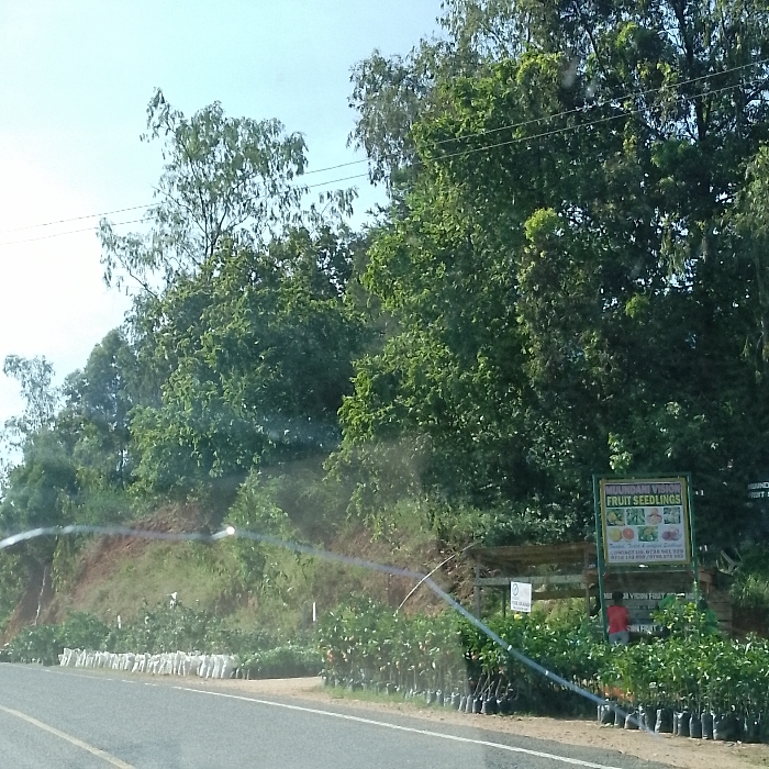 The image displays an outdoor scene along a roadside in Kola ward, Kenya, under a clear blue sky. In the foreground, a section of an asphalt road is visible on the left, bordered by a dirt and grass verge. Along this verge, numerous fruit seedlings in black plastic pots are arranged in multiple rows. Further back and slightly elevated on a gentle slope, rows of white bags, possibly containing plants or soil, are also lined up. On the right side of the frame, a prominent rectangular green sign with yellow and white text and colorful fruit illustrations reads "MUKANDANI VISION FRUIT SEEDLINGS," displaying various fruits such as mangoes, avocados, and lemons, along with contact numbers. A smaller sign, partially obscured, is positioned below it. Behind these signs, a wooden structure is visible. A single individual, dressed in a red shirt, stands partially obscured by the main sign and among the potted plants. The background consists of a dense canopy of green trees and foliage covering the higher ground. Two horizontal power lines are visible across the upper-mid section of the sky.