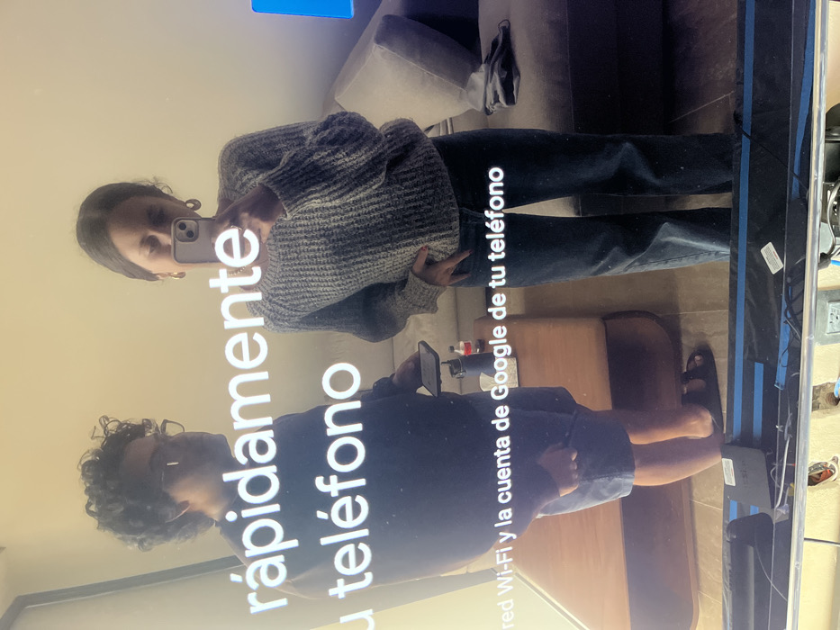 The image displays a reflection of two people standing in front of a screen, presumably a television or large monitor. The reflection includes a woman in a gray sweater and jeans, holding a phone up to take a picture. Reflected below her is a man with curly hair, glasses, a dark shirt, and shorts. The screen displays text in Spanish, including the words "rápidamente" and "teléfono," as well as text mentioning Wi-Fi and a Google account. A couch and other household items are visible in the background, also as reflections.