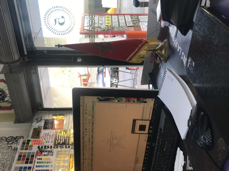 The image presents an interior view of a commercial space, likely a design or print shop, located in Meknes, Morocco, looking out onto a street scene during daytime. In the foreground, a dark desk holds a black computer monitor displaying graphic design software with a vector outline of an interlaced five-pointed star. A black computer keyboard and a black optical mouse on a dark mousepad are positioned below the monitor. A white, spiral-bound notepad with handwritten Arabic script rests on the desk to the right of the keyboard. Further right, a small Moroccan flag, red with a green pentagram and gold fringe, stands on a golden base. A dark folder or book is also visible on the desk, which features printed text, including "ALCAMO" and a logo. The interior background, to the left, consists of a wall covered with numerous display samples: color charts, metallic signs with Arabic text, numbers, and some English words like "PUB." A gray roller shutter mechanism is visible above the doorway. Through the glass doorway and window, a bright street scene is observed. A white SUV is partially visible, parked on the street, along with a portion of a red bicycle. A circular logo with the number "5" is present as a decal or reflection on the glass pane to the right. Other display boards, possibly demonstrating license plate designs or numerical sequences (e.g., "HB-451 M," "D2-LH-DL," "6323"), are visible beyond the Moroccan flag. Green tree foliage is discernible in the distant outdoor environment. No people are present in the frame.