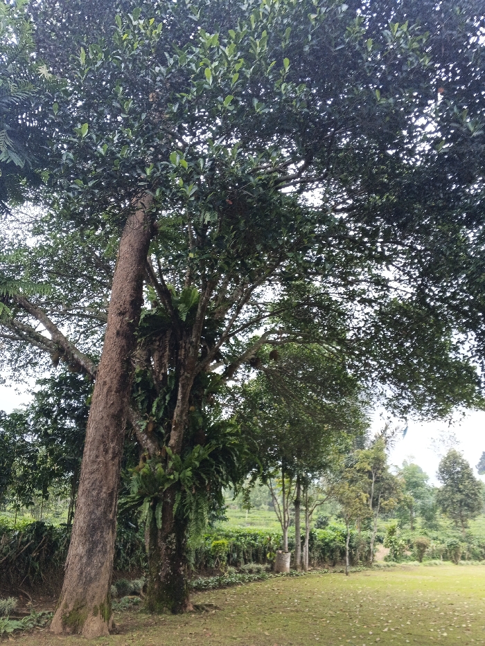 The image displays an outdoor scene dominated by dense foliage under an overcast sky. In the foreground and midground, two large trees stand prominently. The tree on the left features a thick, dark brown trunk, partially covered in green moss near its base, extending upwards out of frame. Adjacent to it, a second tree with multiple visible trunks and branches is heavily adorned with large, green epiphytic ferns. The canopies of these trees are densely packed with dark green leaves, obscuring much of the sky directly above. The ground beneath the trees is covered in a layer of green grass and scattered brown debris, possibly fallen leaves. A strip of manicured smaller green plants forms a border along the base of the main trees and extends into the midground. In the background, a verdant landscape unfolds, characterized by rows of cultivated green plants, consistent with a plantation, possibly tea or coffee. Several smaller, slender trees are interspersed within this background vegetation. A light-colored, cylindrical object, possibly a marker or small planter, rests on the grass in the midground to the right. No people or animals are present. The specific location within Lokossa, Benin, cannot be determined from the visual information provided in the image.