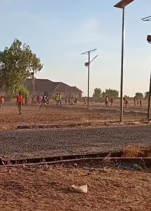 A video shows a dusty, dirt field with several people playing soccer in the distance. The field appears to be under construction, as there are piles of gravel and recently installed solar-powered streetlights lining the area. Several children are running and playing soccer in the distance. The sky is clear and blue. A residential building is visible in the background. The camera is fairly static and slightly shaky, seemingly held by hand. A plastic bag sits in the lower right corner.