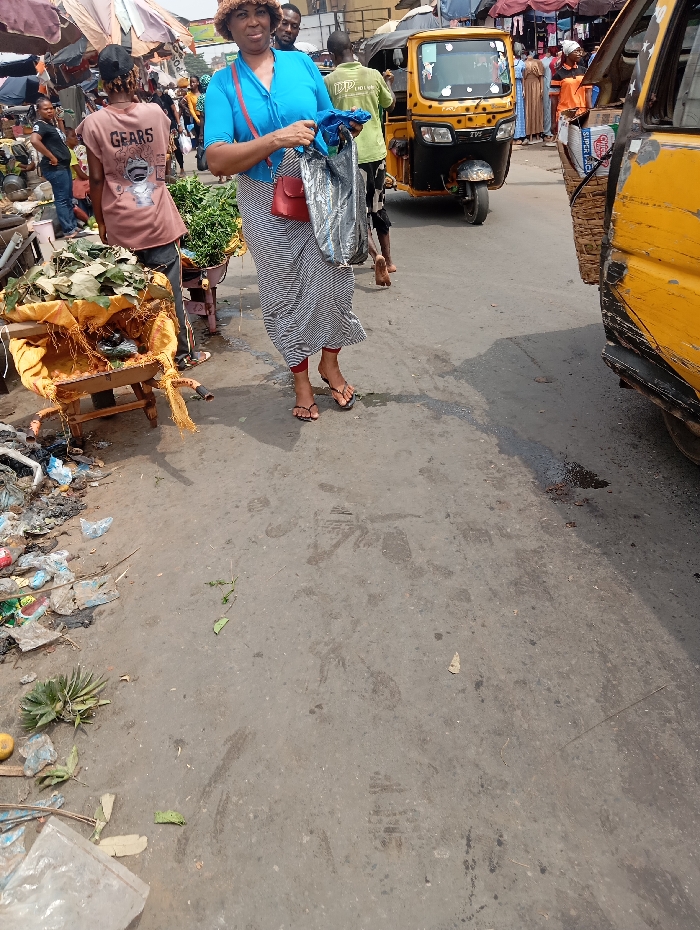 The image depicts a bustling street market scene in Onitsha, Nigeria, characterized by human activity, commercial goods, and vehicular presence. The ground is a dirty, uneven concrete or asphalt surface, littered with plastic debris, organic matter, and visible footprints and tire marks. In the mid-foreground, a woman, estimated to be middle-aged, walks toward the viewer. She wears a light blue short-sleeved top, a black and white striped skirt, and black flip-flops with red-painted toenails. Her head is covered by a reddish-brown bucket hat, and she carries a small red shoulder bag and a black plastic bag in her left hand. She has a faint smile. To her left, a makeshift wooden cart or wheelbarrow holds a large quantity of green leafy vegetables, possibly wrapped in yellow fabric. Another individual, seen from behind, wears a brown t-shirt with "GEARS" and a graphic design. Further back, a yellow three-wheeled auto-rickshaw, branded "TVS," is visible on the street. To the right of the frame, the front-right section of a heavily soiled and scratched yellow commercial vehicle, possibly a bus or large van, is partially visible. A woven basket attached to its side contains various packaged goods, including items marked "SUPER PACK." The background reveals numerous other individuals amidst market stalls with tarpaulin and fabric awnings, indicating a dense commercial area. Distant buildings appear worn. The overall lighting suggests daylight conditions.