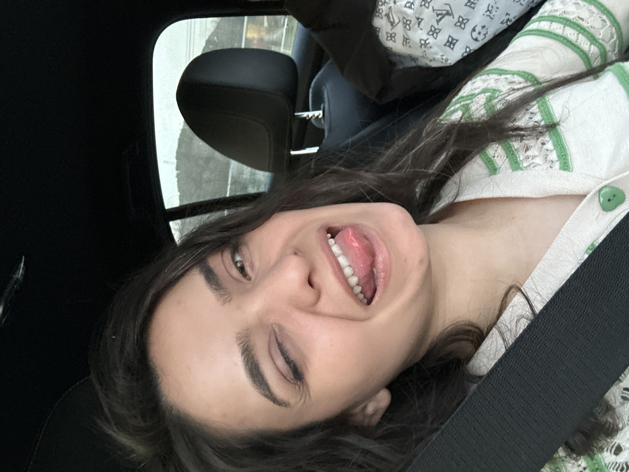 A young woman is in a car, wearing a seatbelt. She has dark hair and is wearing a white blouse with green stripes. Her tongue is sticking out and she is winking. The location appears to be inside a car, potentially in motion, but the city of Kirkovo, Bulgaria, cannot be determined from the image. The background shows the car's interior and the outside, visible through the window.