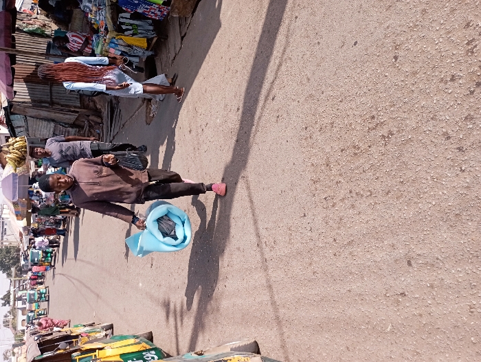 This image captures a daytime street scene in a market area of Jos, Nigeria. The ground consists of a light-colored, worn asphalt or concrete road, showing numerous shadows cast by individuals and structures, indicating strong sunlight from the right. In the foreground, slightly left of center, a young male subject walks towards the viewer. He wears a brown, long-sleeved collared shirt with black stripes on the sleeves, black athletic pants, and pink slip-on shoes. He carries a rolled-up, light blue mat-like object in his left hand and a black plastic bag in his right. To the right, in the midground, a female subject with long, reddish-brown braided hair walks away from the viewer. She wears a light blue, mid-thigh-length tunic over white shorts and light-colored sandals, holding a white object in her left hand. Behind her is a market stall constructed with corrugated metal, topped by a red umbrella. The stall displays various items of clothing, including t-shirts and jerseys, hung for sale, with additional merchandise visible on shelves. A person is partially visible seated within this stall. Further back and to the right, a male subject with a bunch of bananas balanced on his head walks towards the viewer, dressed in a grey t-shirt and dark pants, carrying a black bag over his shoulder. Another male subject, wearing a grey t-shirt and dark pants, walks away from the viewer, carrying a black bag over his left shoulder, positioned behind the central young male. On the left side of the midground, several green and yellow "Keke Napep" (auto-rickshaws) are visible, parked or in motion along the roadside. A woman in a pink dress walks further down the street on this side. The background features additional market stalls with diverse umbrellas, various buildings, and more distant people and vehicles, indicating a busy urban environment.