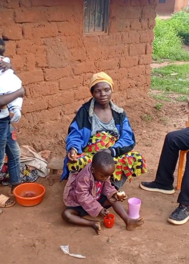 family group outside a mud brick house. A man is sitting in a yellow plastic chair. He is wearing black pants, a tan shirt, and a vest. He is facing a woman sitting on the ground in front of the house. She is wearing a yellow headscarf, a blue jacket, and a colorful skirt. A young child is sitting in front of her on the ground, playing with a small object and a pink plastic cup. Another young boy is standing near the woman, holding a baby. A third boy is standing near the door of the house, drinking from a cup. There is a bowl and some other items on the ground near the woman and children. The ground is dirt, and there is grass and vegetation in the background.