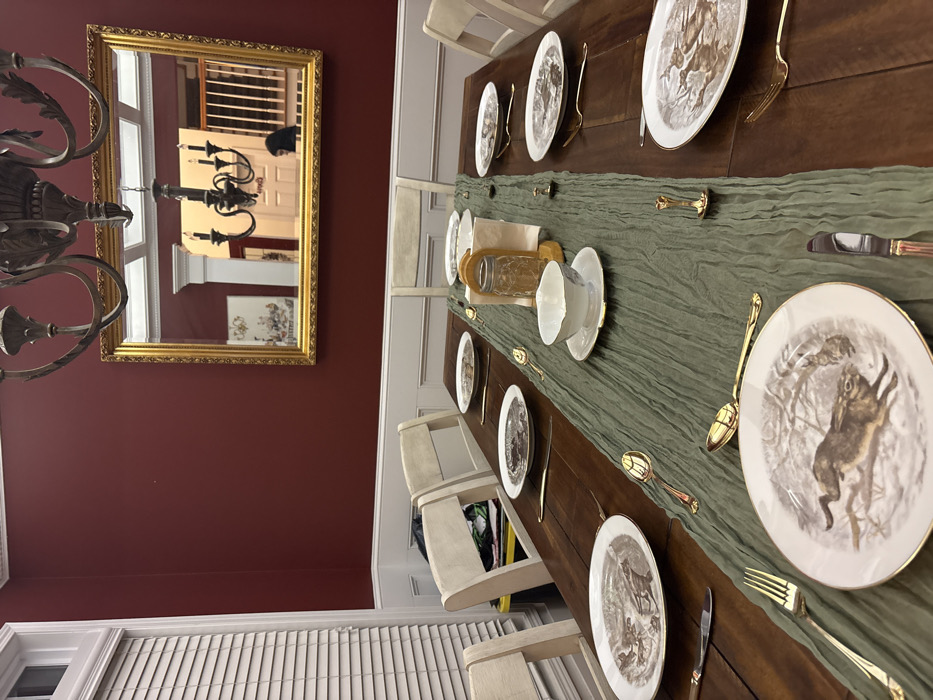 A long wooden dining table is set with plates depicting hares, gold-toned cutlery, and a sage green runner